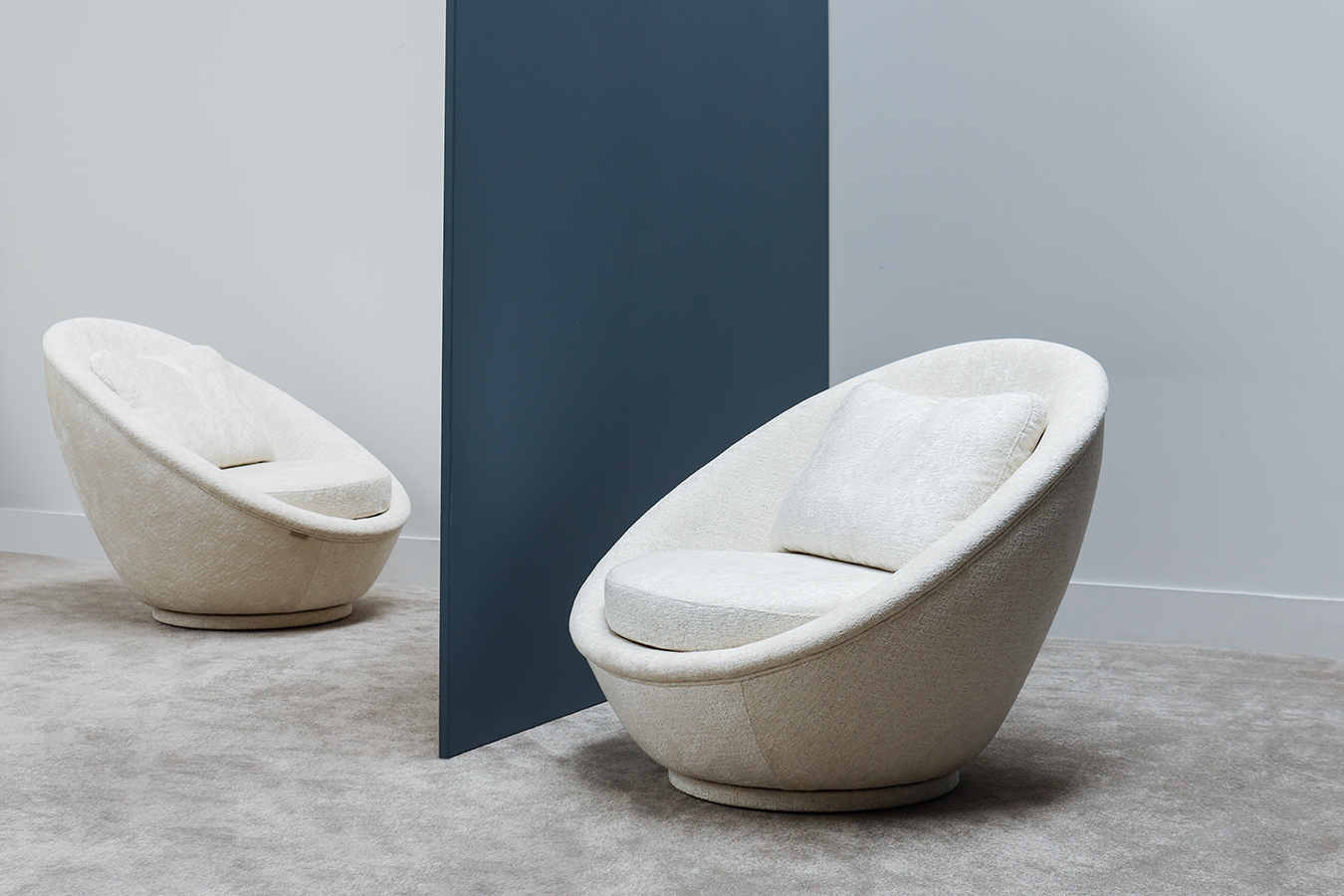 With its enveloping structure framed by piping and its independent seat cushion resting on a swivel base, the Aggi II armchair is a profusion of curves and an explosive aesthetic.