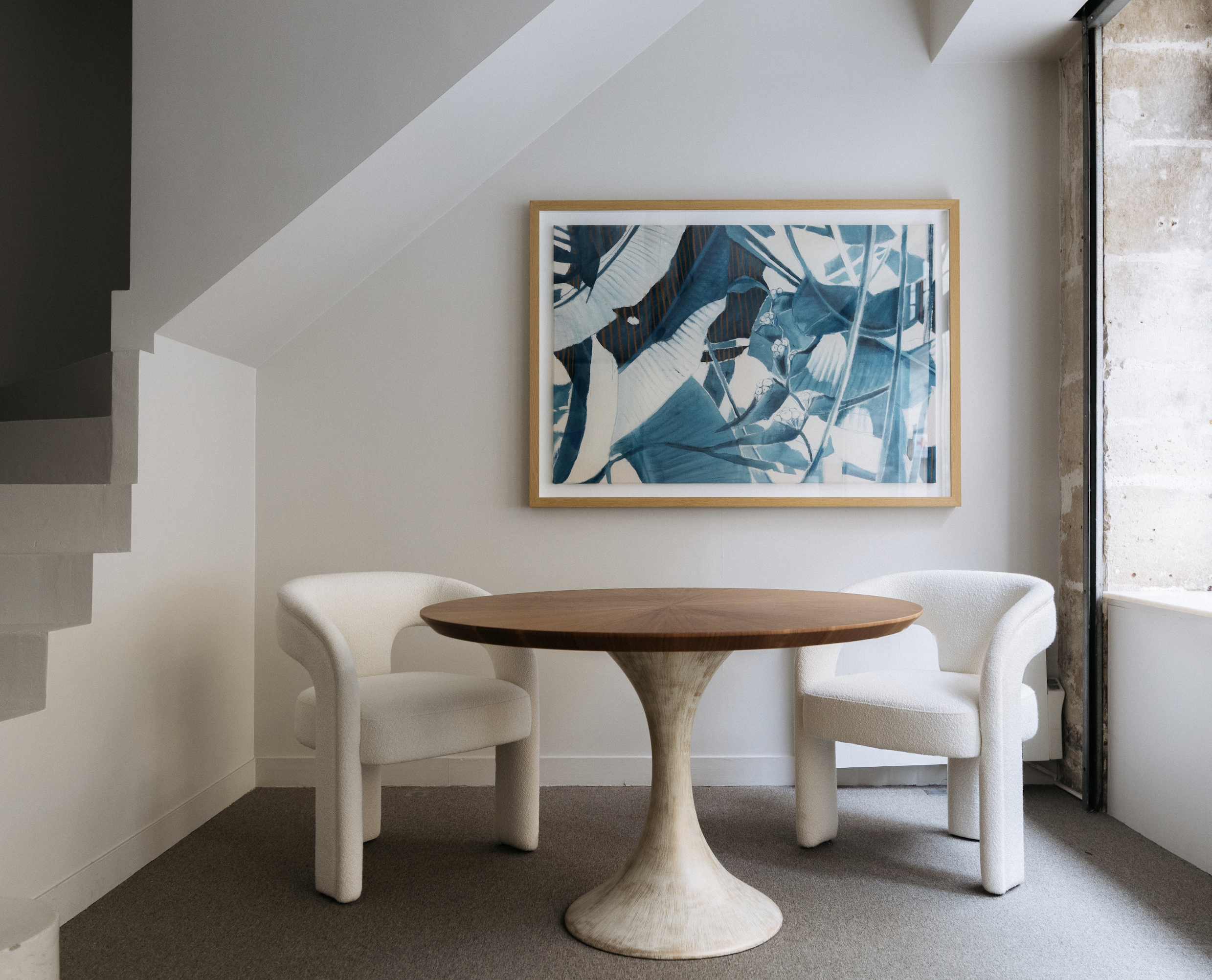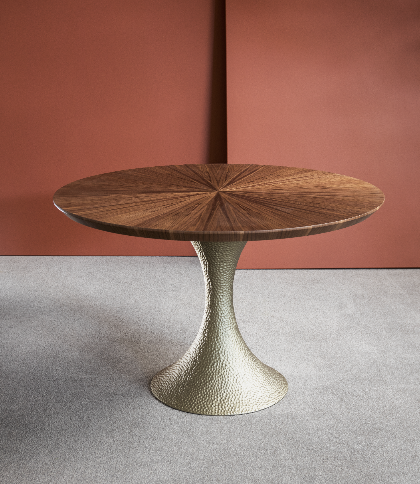 The Inès dining table is the perfect union of beauty and practicality. Its hammered or smooth resin pedestal and variety of surfaces, give it a unique and luxurious look, while guaranteeing a dining experience in the utmost comfort once the clutter of the traditional four legs has been eliminated.