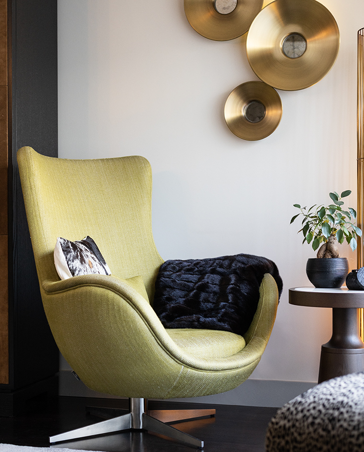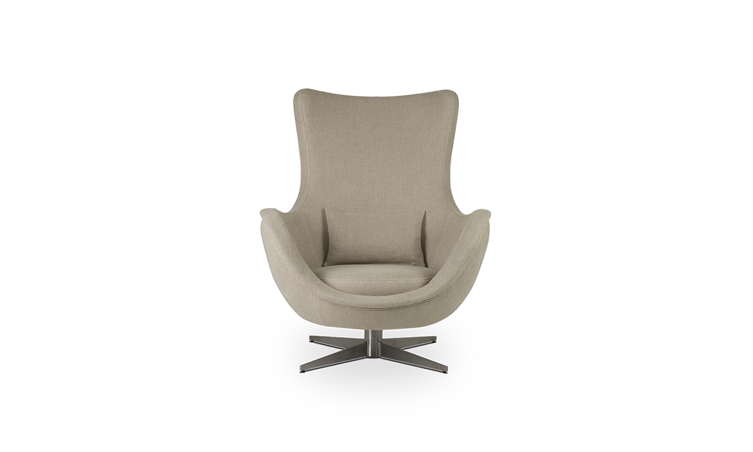 The Irene lounge chair is available with FR foam, a solid wood structure and rotating metal base in either brushed stainless steel or brass effect. It is available in Cat. A-C fabrics and leathers (Armchair: 5,0m / un. // Ottoman: 1,6m / un.) with the possibility of client fabric. Ottoman sold separately.