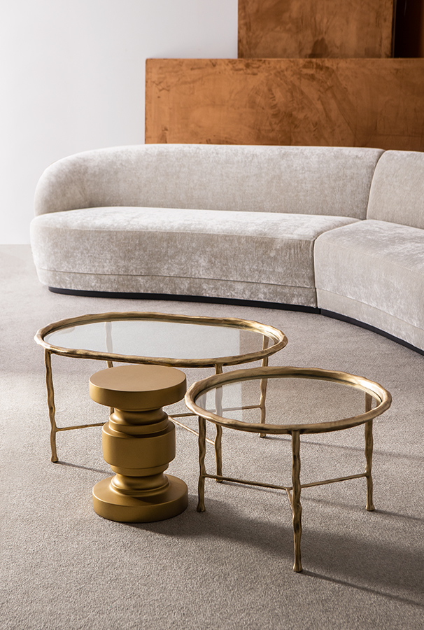 Taking inspiration from the natural world, Lupa tables marry form and function. Natural stone or glass tops are enhanced by a cast brass structure for its inimitable gilding or cast aluminium for a cooler visual. Whether you opt for the round or oval versions, Lupa tables offer a wide range of possibilities, alone, combined or with other tables to create intriguing vignettes.